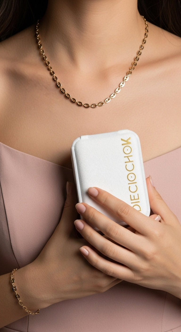 Nuestras cadenas están hechas en oro laminado 18K, con materiales antialérgicos, y con garantía de por vida por cambio de tono. Porque creemos que lo que brilla contigo… debe durar.